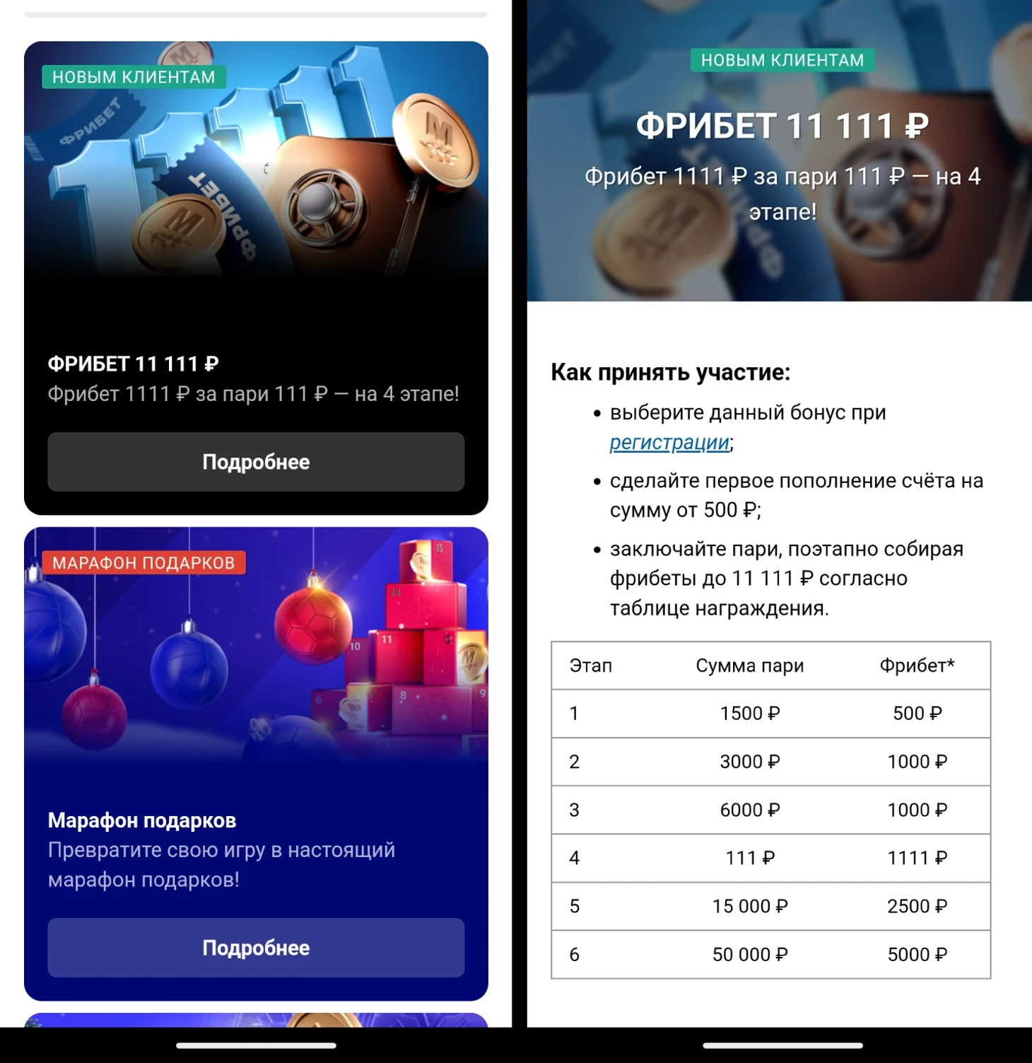 - Этап 4: Сумма пари – 111 рублей → фрибет 1 111 рублей .