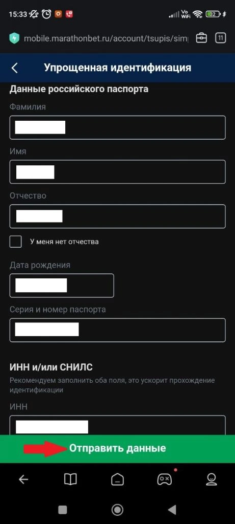 Последовательно вводим коды из сообщений. После проверки номера букмекер попробует найти его в системе ЦУПИС, чтобы идентифицировать аккаунт.